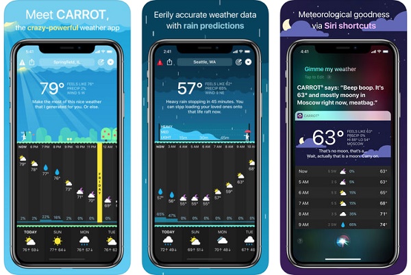 این اپلیکیشن با دسترسی به چهار منبع آبوهوایی مختلف از جمله Dark Sky، یکی از دقیقترین اپلیکیشنهای پیشبینی آبوهوا است. برایان مولر، توسعه دهندهی Carrot Weather، خیلی شفاف دیدگاهش را درمورد بحثهای اخیر بر سر فروش اطلاعات بیان کرده: