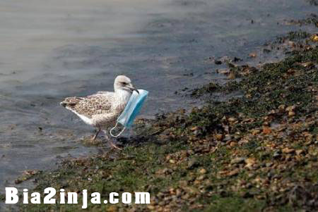 ماسک دور انداخته شده در منقار یک مرغ دریایی در شهر ساحلی “دووِر” در جنوب شرق بریتانیا
