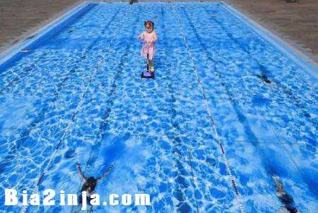 دختر خردسال اسکوترباز روی یک نقاشی سهبعدی از استخر در شهر لندن