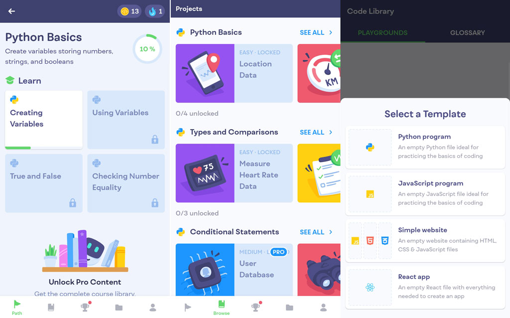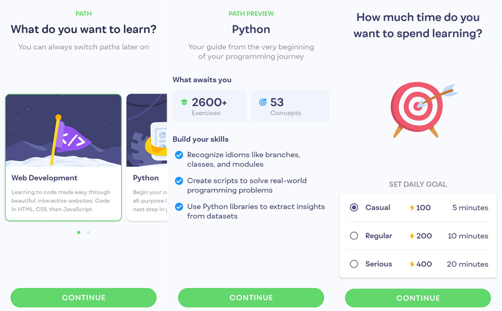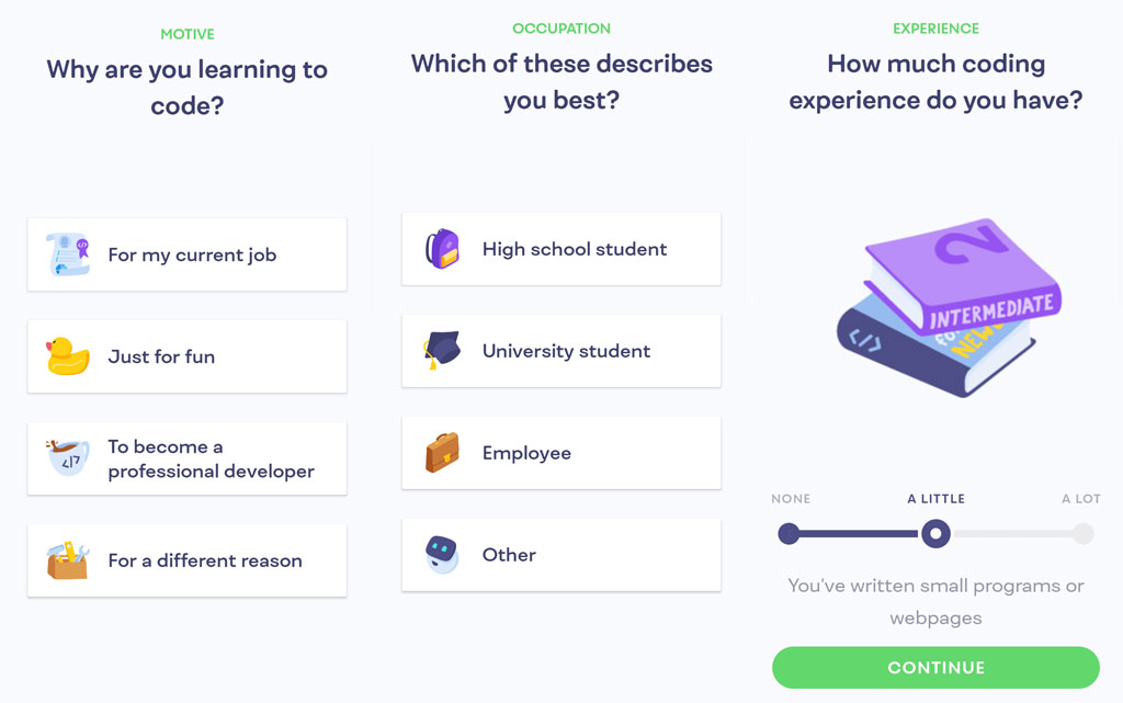 در حال حاضر کاربران میتوانند اقدام به یادگیری زبانهای HTML، پایتون، SQL، جاوا اسکریپت و CSS کنند. اپلیکیشن به کمک دریافت پاسخ پیرامون پرسشهای ابتدایی میتواند سطح و تجربه یادگیری سفارشی را در اختیار هر فرد قرار دهد. پس از نصب برنامه، ابتدا باید علت یادگیری کدنویسی را شرح دهید که میتواند به صورت تفریحی، جهت ارتقای مهارتها در شغل فعلی یا پیدا کردن شغل مرتبط در آینده باشد.